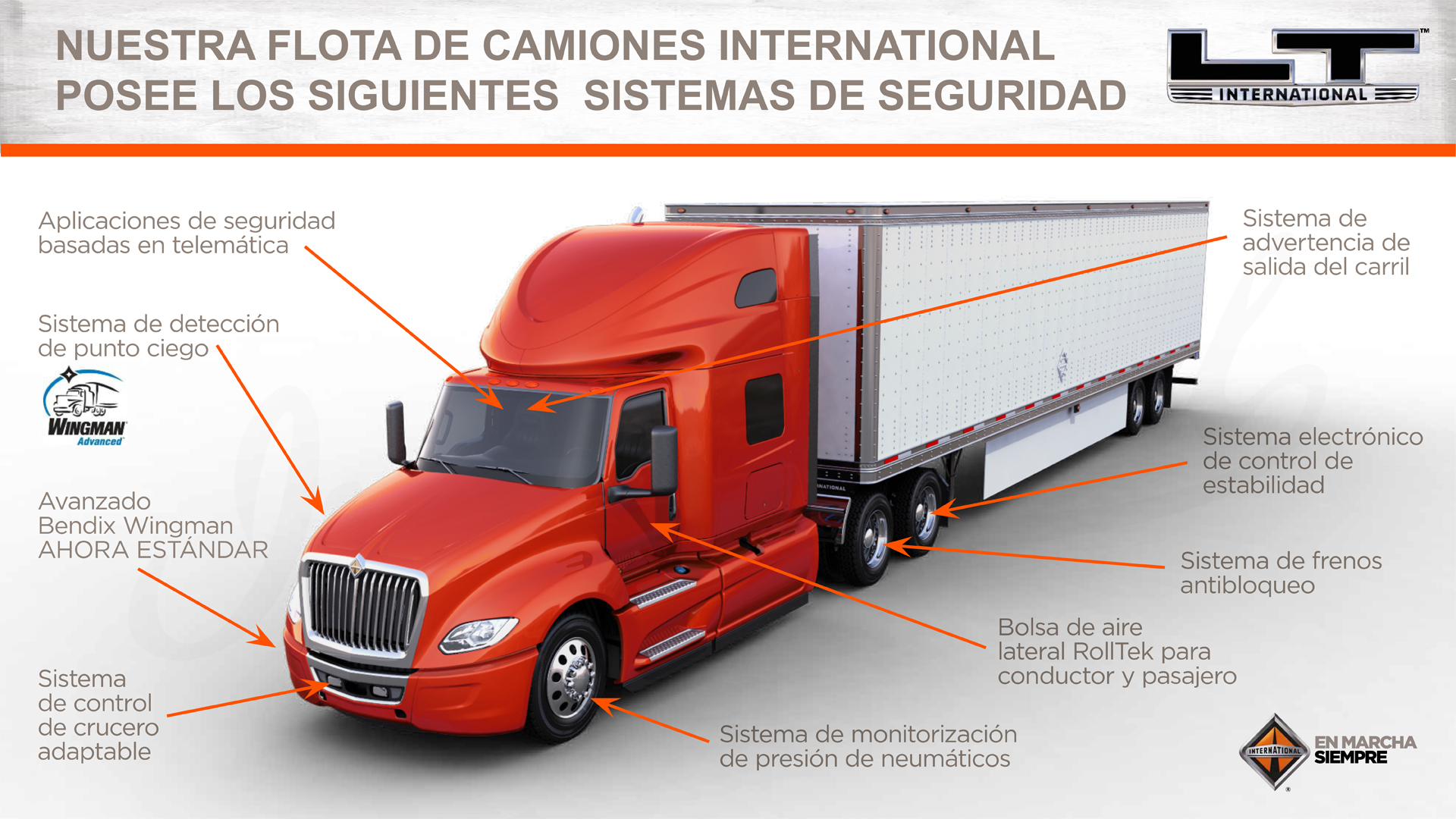 Como parte de las caracteristicas estándar, nuestra Flota International cuenta con equipamiento de seguridad superior, que es el sistema Navistar Bendix® Wingman® Fusion™. (ver video)